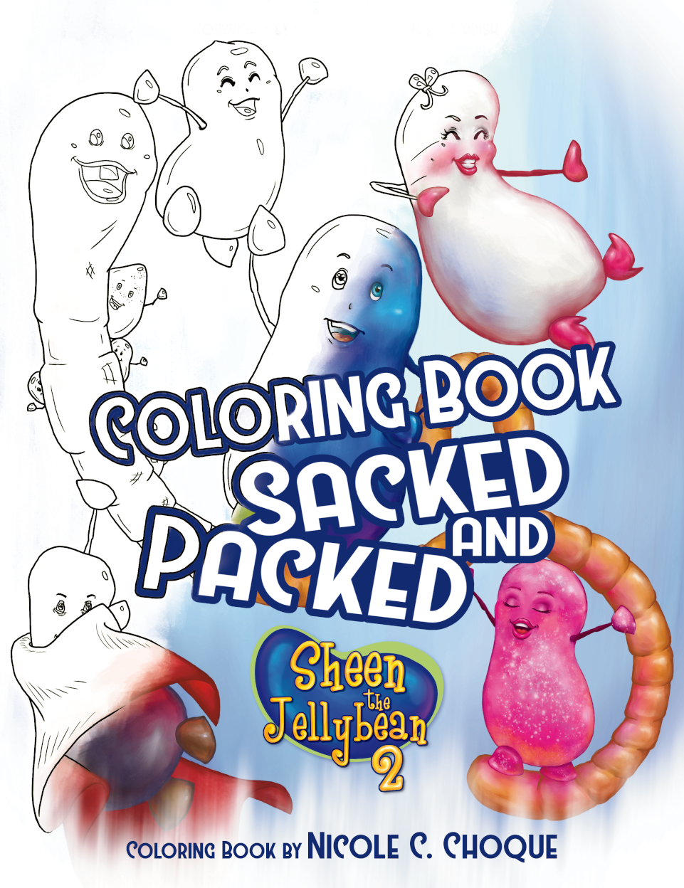 Full Sized, 8.5″ x 11″ Paperback book | Jellybean Coloring Book: Sacked & Packed! now available! (click to purchase on Amazon-com)